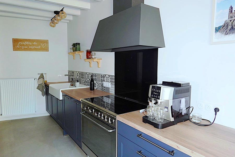 Une cuisine entièrement équipée : Conçue pour satisfaire les cuisiniers exigeants, elle dispose d’un grand piano avec plaques à induction, d’un réfrigérateur, d’un lave-vaisselle, d’une cafetière à grains ou moulu Delonghi, toute la vaisselle nécessaire pour concocter de bons repas, ainsi que des produits de base (café, thé, produit vaisselle, sacs poubelle, huile, vinaigre, sel, poivre, etc.).